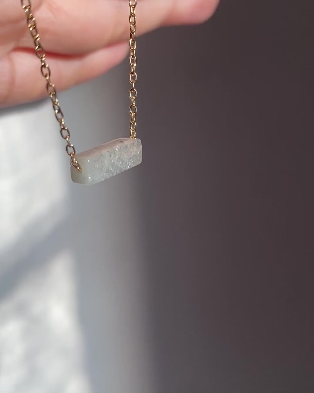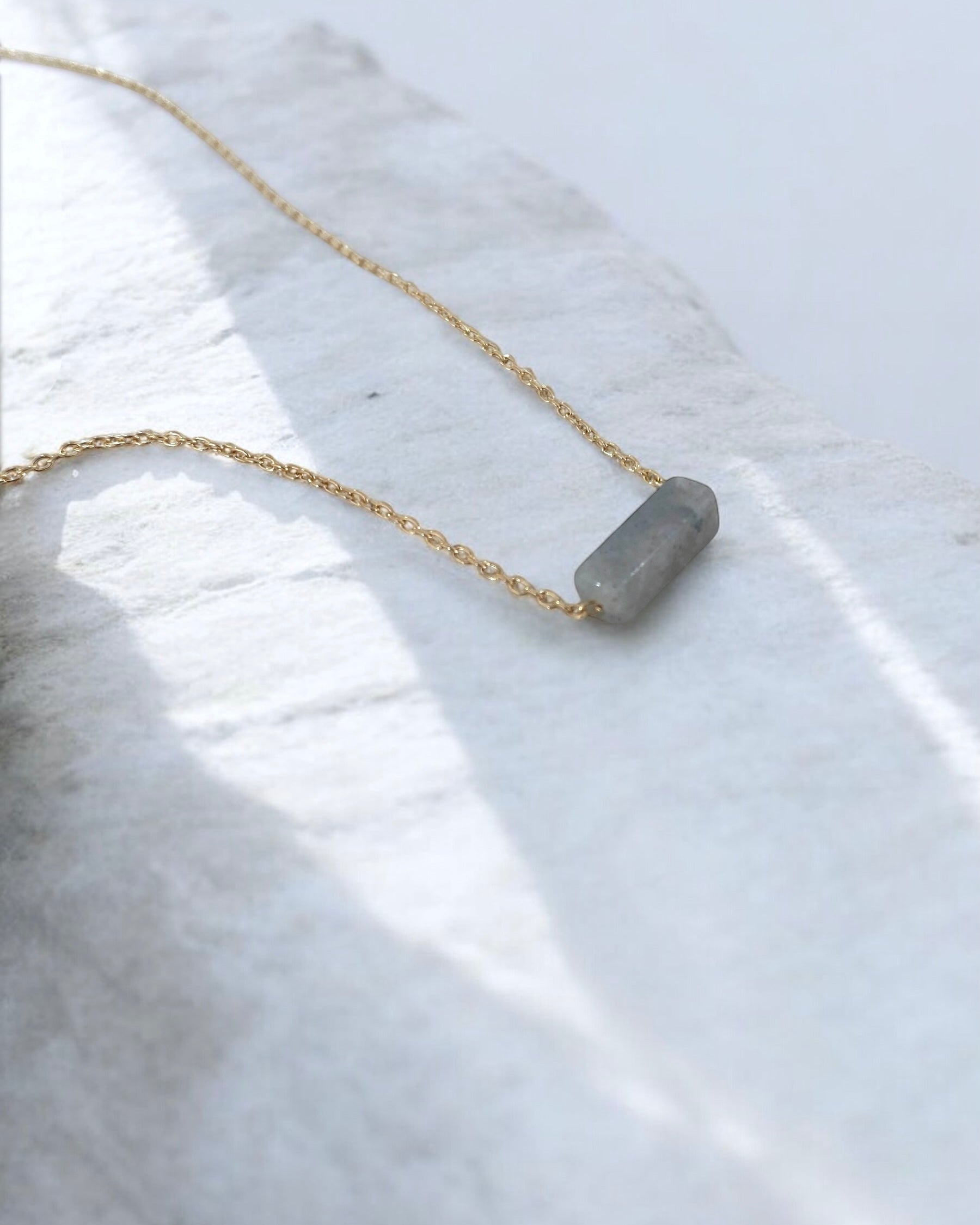Rectangle labradorite necklace handcrafted in sterling silver with 18k gold plating. The chain is 41 cm long but can be adjusted to 46 cm.