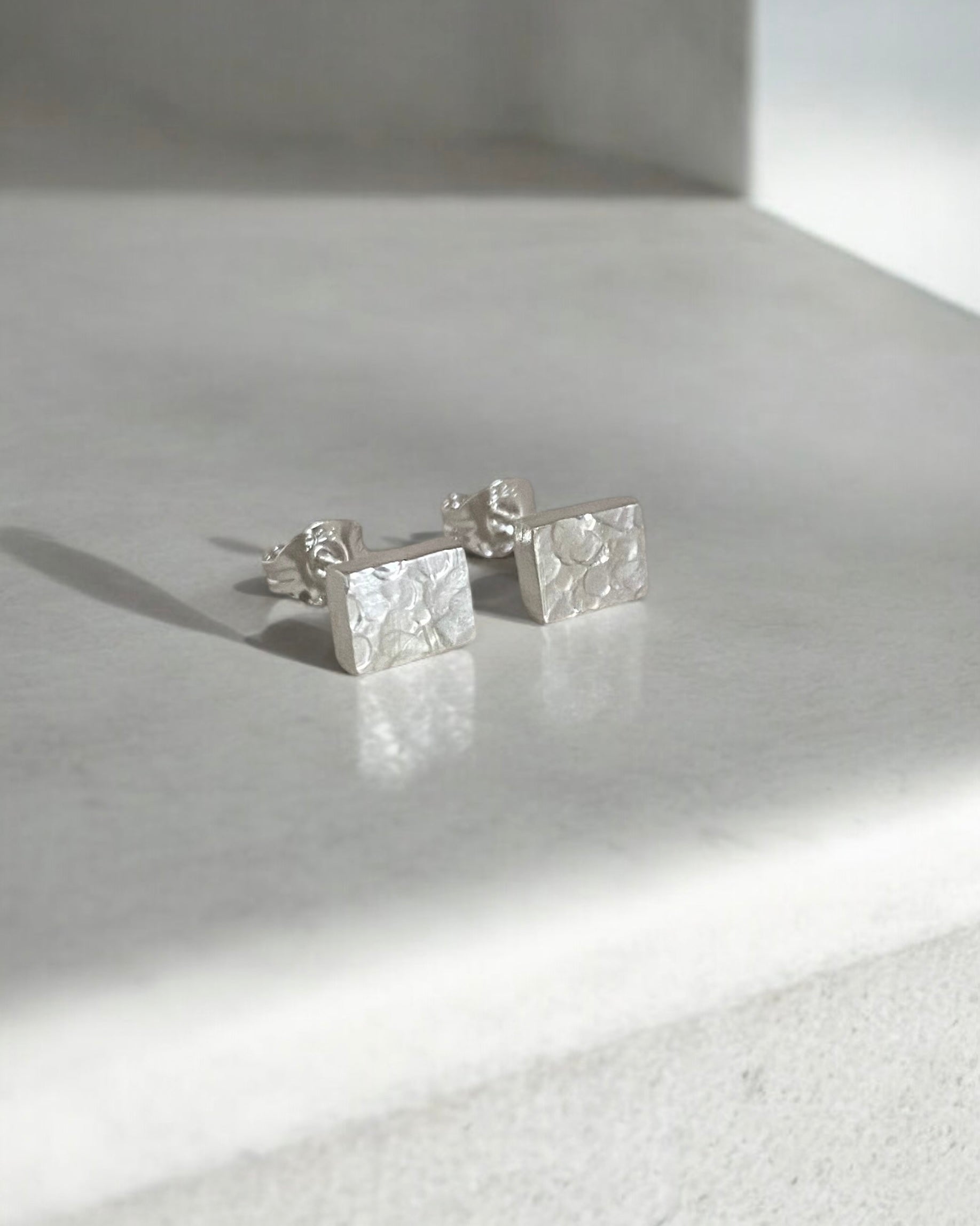 Hammered-texture sterling silver rectangle medium studs.
