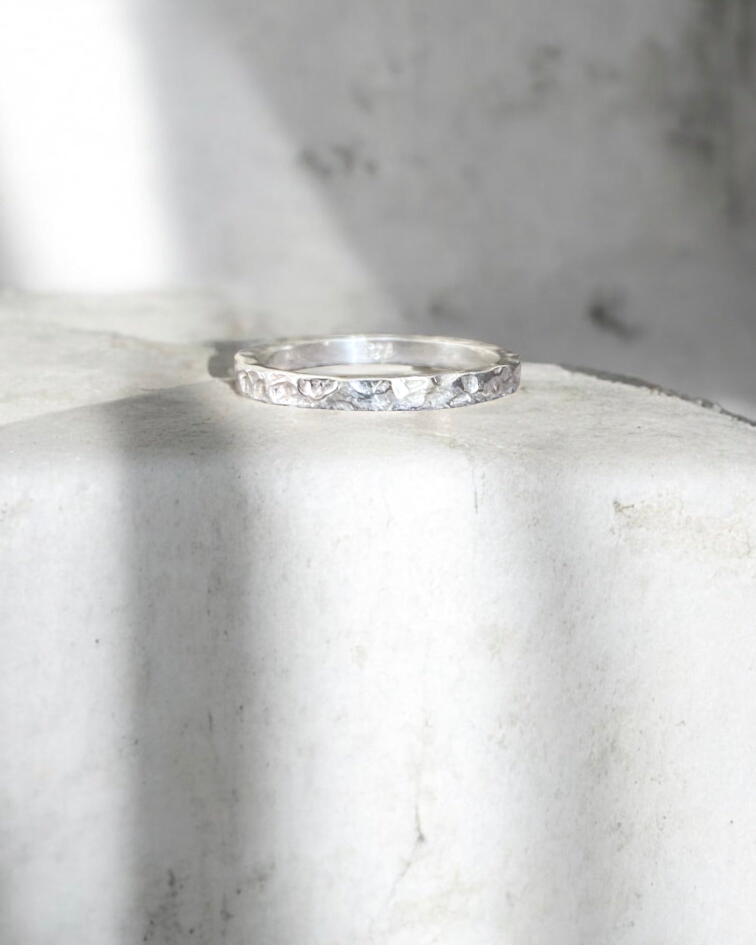 Handmade hammered-texture sterling silver ring with 2 mm band.