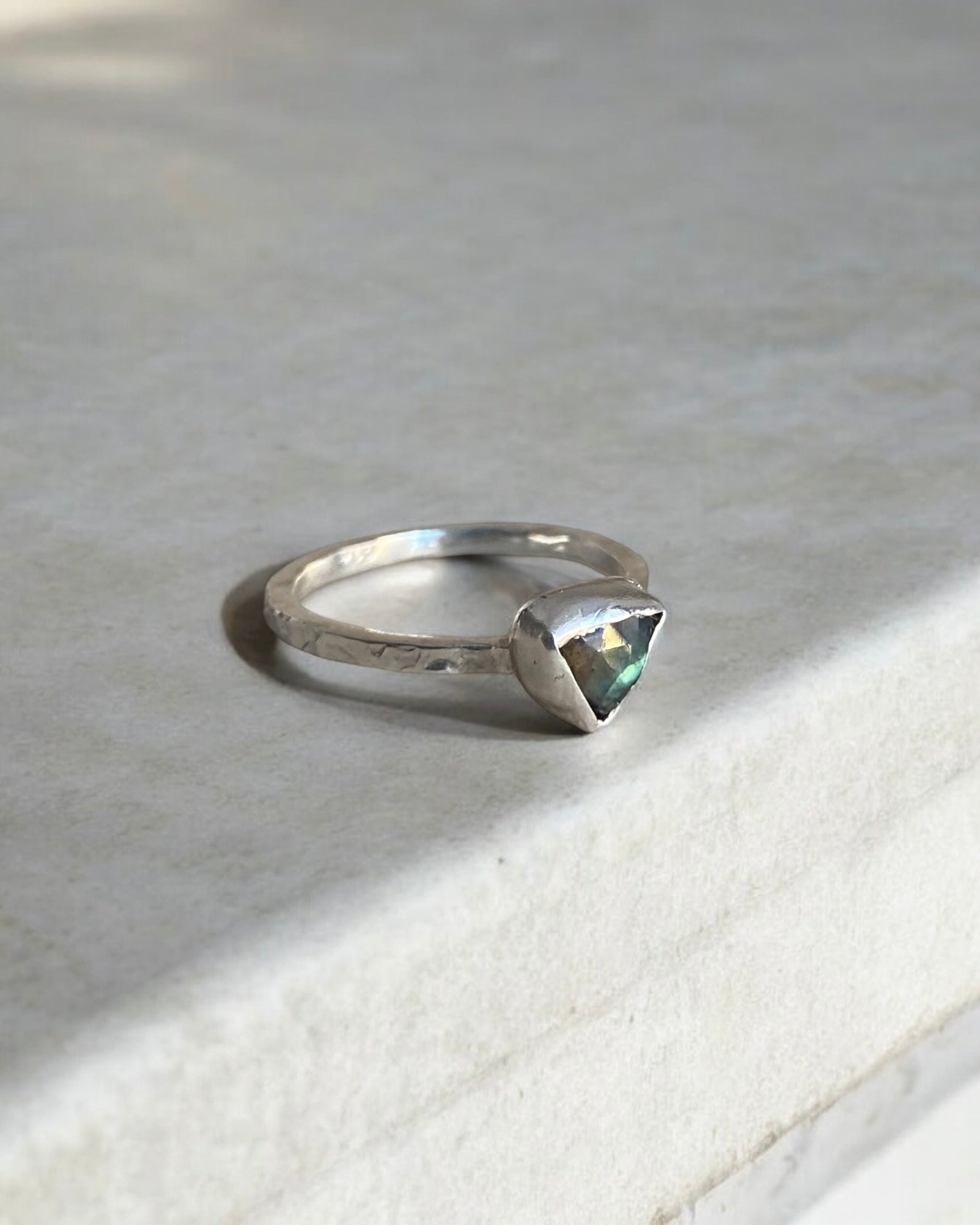 Handmade textured sterling silver ring with triangle shaped faceted labradorite.