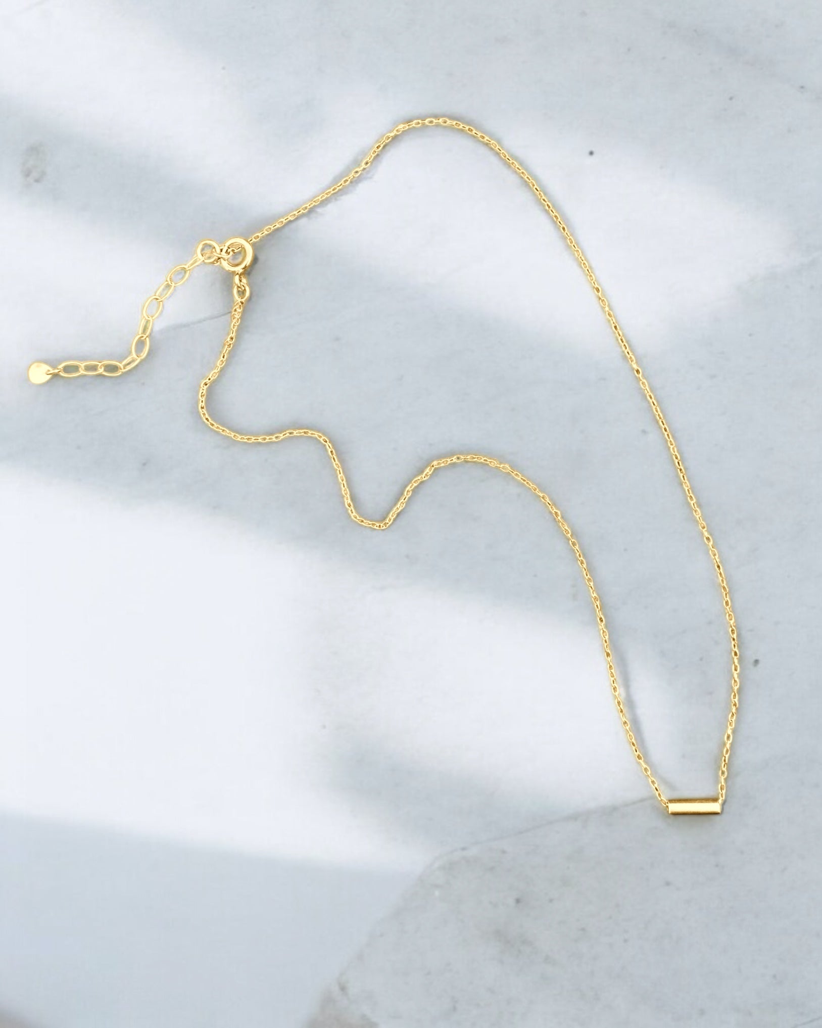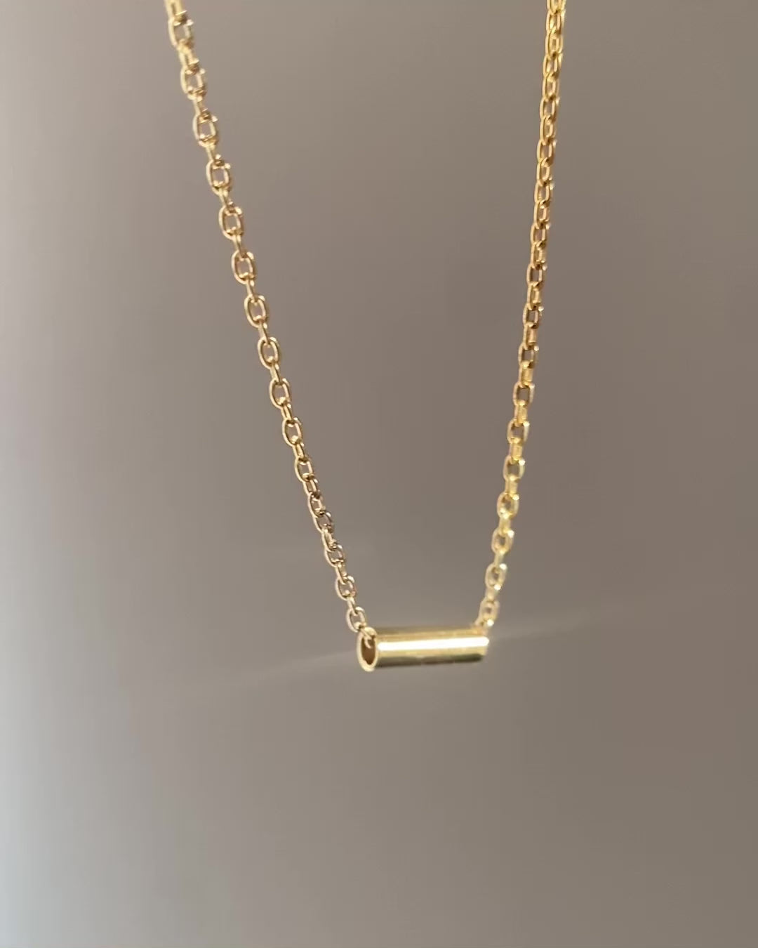 Necklace with small tube handcrafted in sterling silver with 18k gold plating. The chain is 40 cm long but can be adjusted to 45 cm.